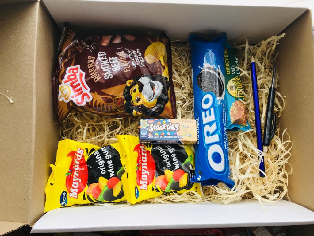 2×Mini Snacks,1×Jungle oat energy bar,1 ×Energy drink,2×Mini Chocolates, 1×Maynards, 2×Ballpoints, 1× Journal book
